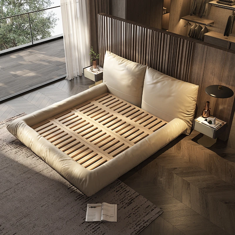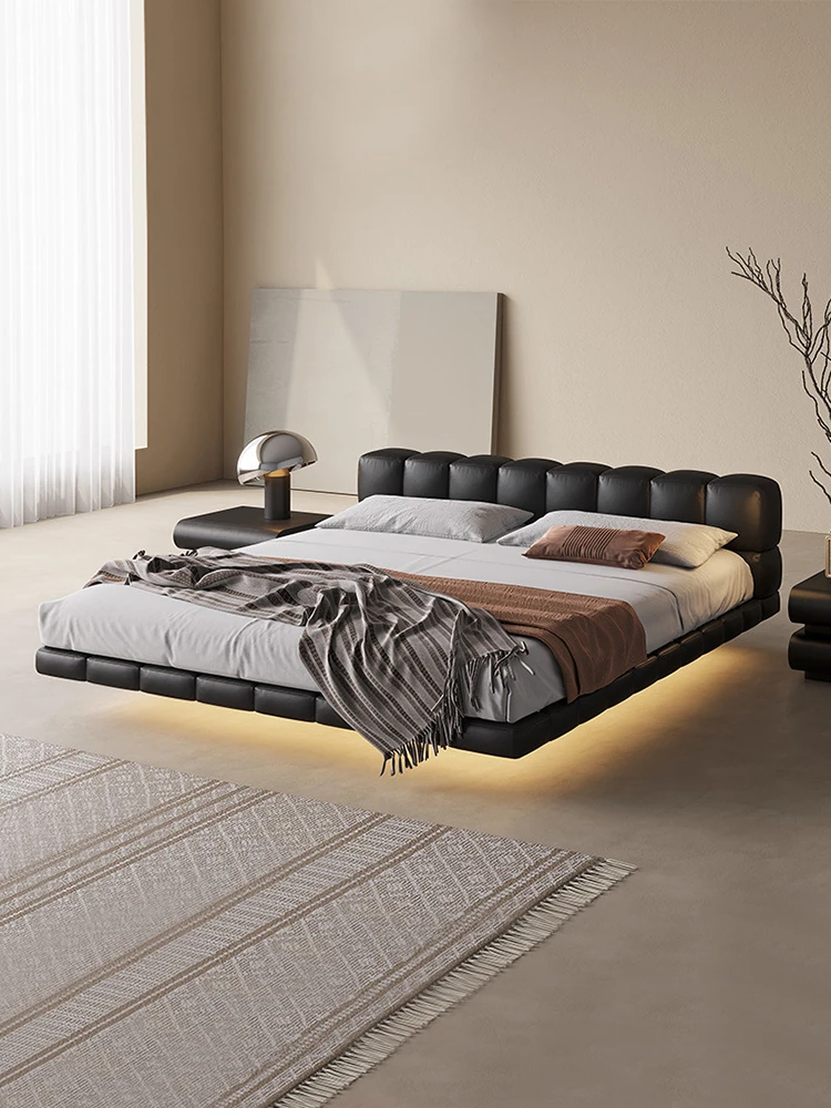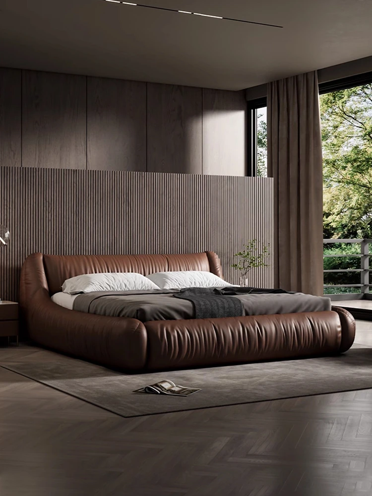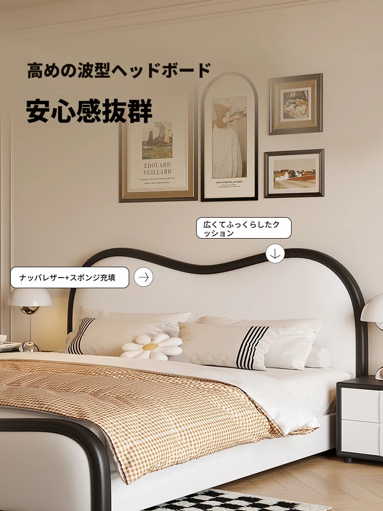 パースン記 波浪型本革ベッド モダンミニマリストクリーム風 イタリアンシンプルダブルベッド 浮遊感のあるマリッジベッド