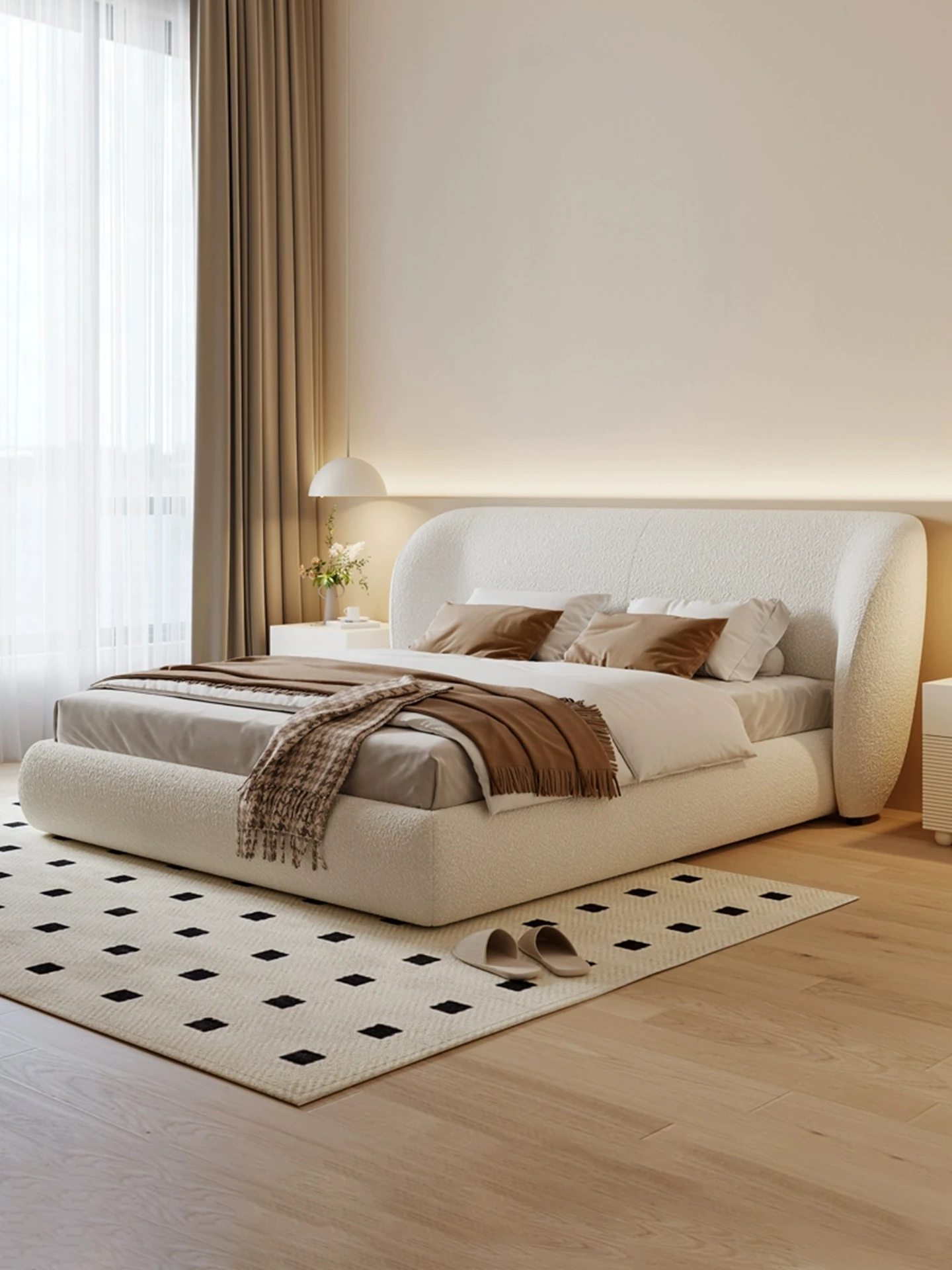 朴笙記のラグジュアリーなラムフリース布団、和の美を感じるクリーム色のデザイン。北欧スタイルの小型ダブルベッドは、榉木のフレームとふわふわのコットンキャンディで、あなたの寝室をおしゃれに演出します。