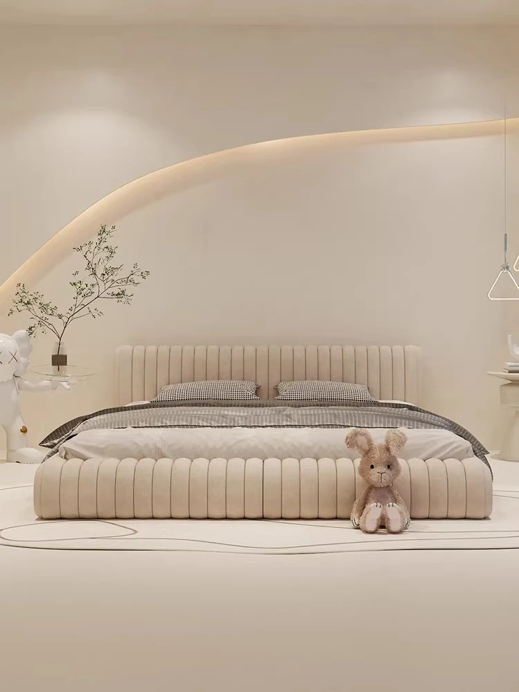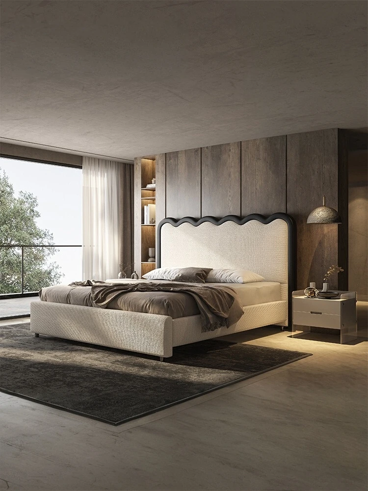 朴笙記のレトロ波紋デザイン、シンプルでモダンな侘び寂びスタイルのクリームカラー布製ベッド。小さなスペースにもぴったりの北欧風ダブルベッドで、あなたの寝室をスタイリッシュに演出します!