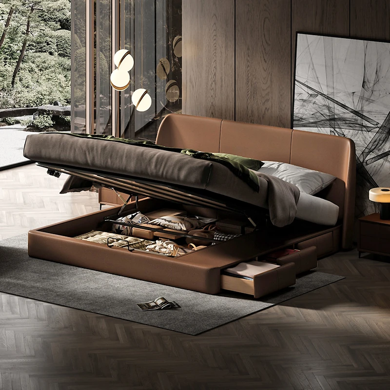 朴笙記のイタリアンデザイン・レザー製ベッド - モダンでシンプルな1.8mダブルベッド、主寝室に最適。2mの収納スペース付きで、軽やかな高級感を演出します!