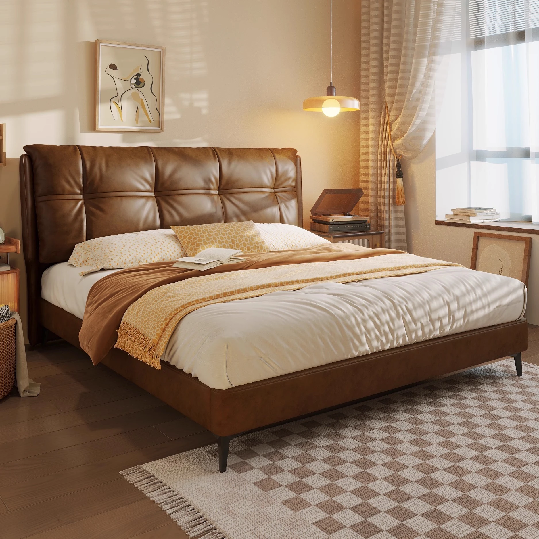 朴笙記 本革モダンシンプル軽奢ヴィンテージ風ダブルベッド 人気のブラウンソフトパッディング 夫婦にぴったりの結婚ベッド!あなたの寝室をスタイリッシュに演出します。
